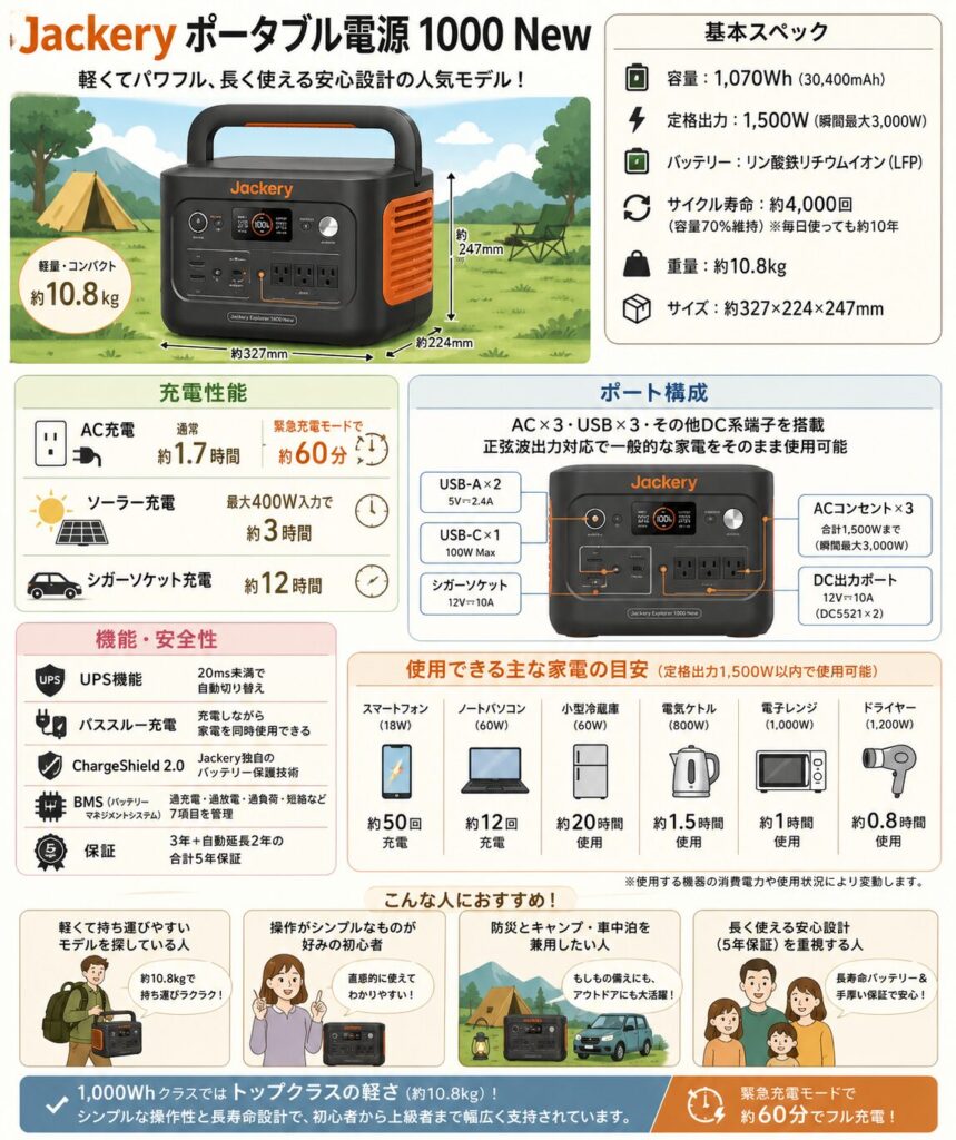 🥈 2位:Jackery ポータブル電源 1000 New(約7〜12万円)