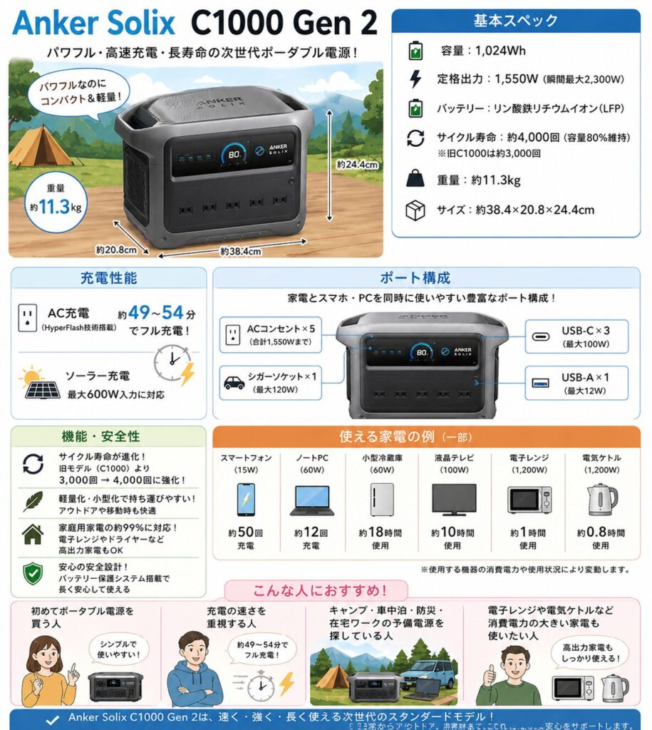 - 2026年の売れ筋1位はAnker Solix C1000 Gen 2。約49〜54分充電・1,550W出力でコスパ最強。初めて買う人にも自信を持っておすすめできる一台
